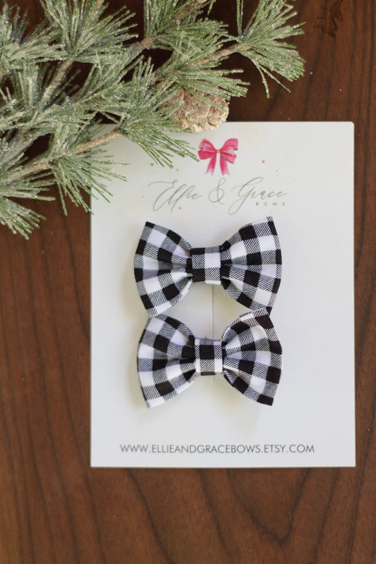 Buffalo Plaid Pigtail Bow Set: Black and White Hair Clips