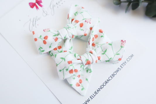 Floral Pigtail Bows: White & Red Cotton Hair Clips (Set of 2)