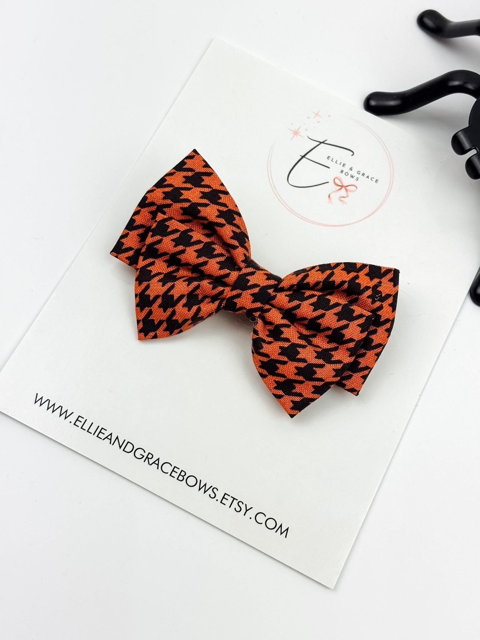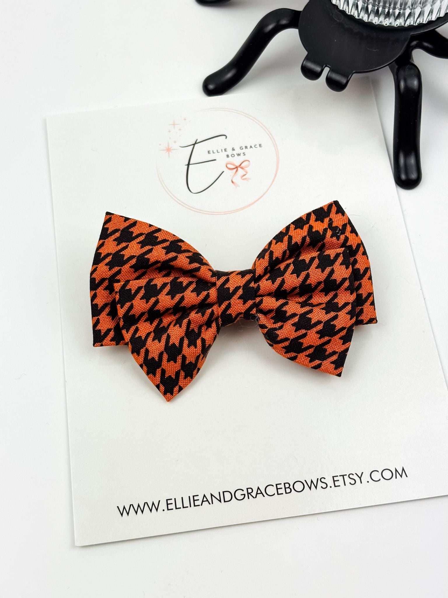 Dress your little one in festive style with this **cotton fabric hair bow**, available as a **single bow** or a **matching pigtail set**. Each bow measures approximately **2 x 3.5 inches** and features a striking orange and black houndstooth print — the perfect Halloween-ready accessory!