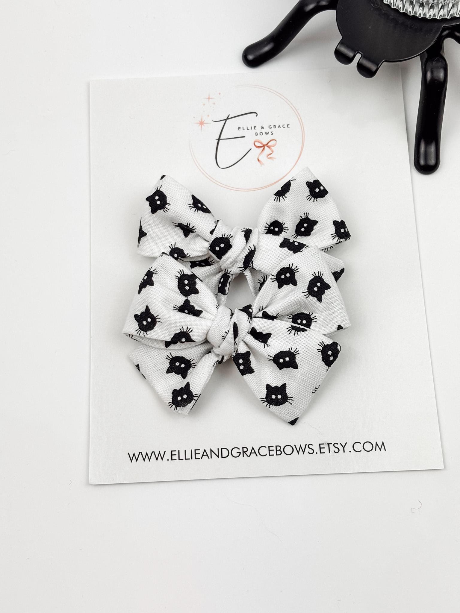 Add a spooky-cute touch to your little one’s Halloween style with this **cotton fabric pigtail bow set**! Each bow measures approximately **2.75 inches** and features an adorable black cat print — the perfect accessory for festive fall outfits.