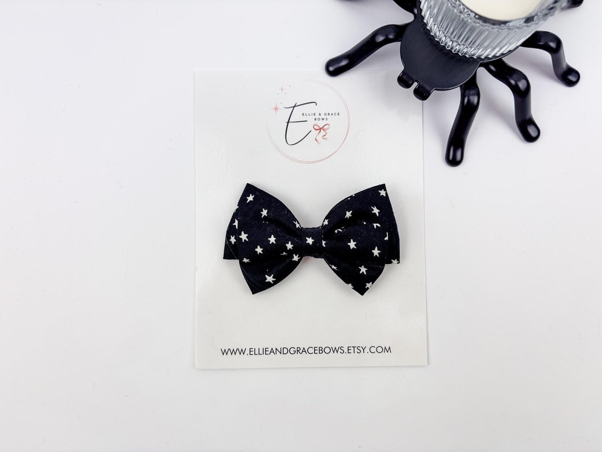 Made from high-quality cotton in a deep black hue and adorned with tiny white stars, this bow is the perfect blend of sweet and spooky. Whether youβre dressing up for a Halloween party, pumpkin patch outing, or simply embracing the season, this pretty bow adds just the right amount of festive charm.