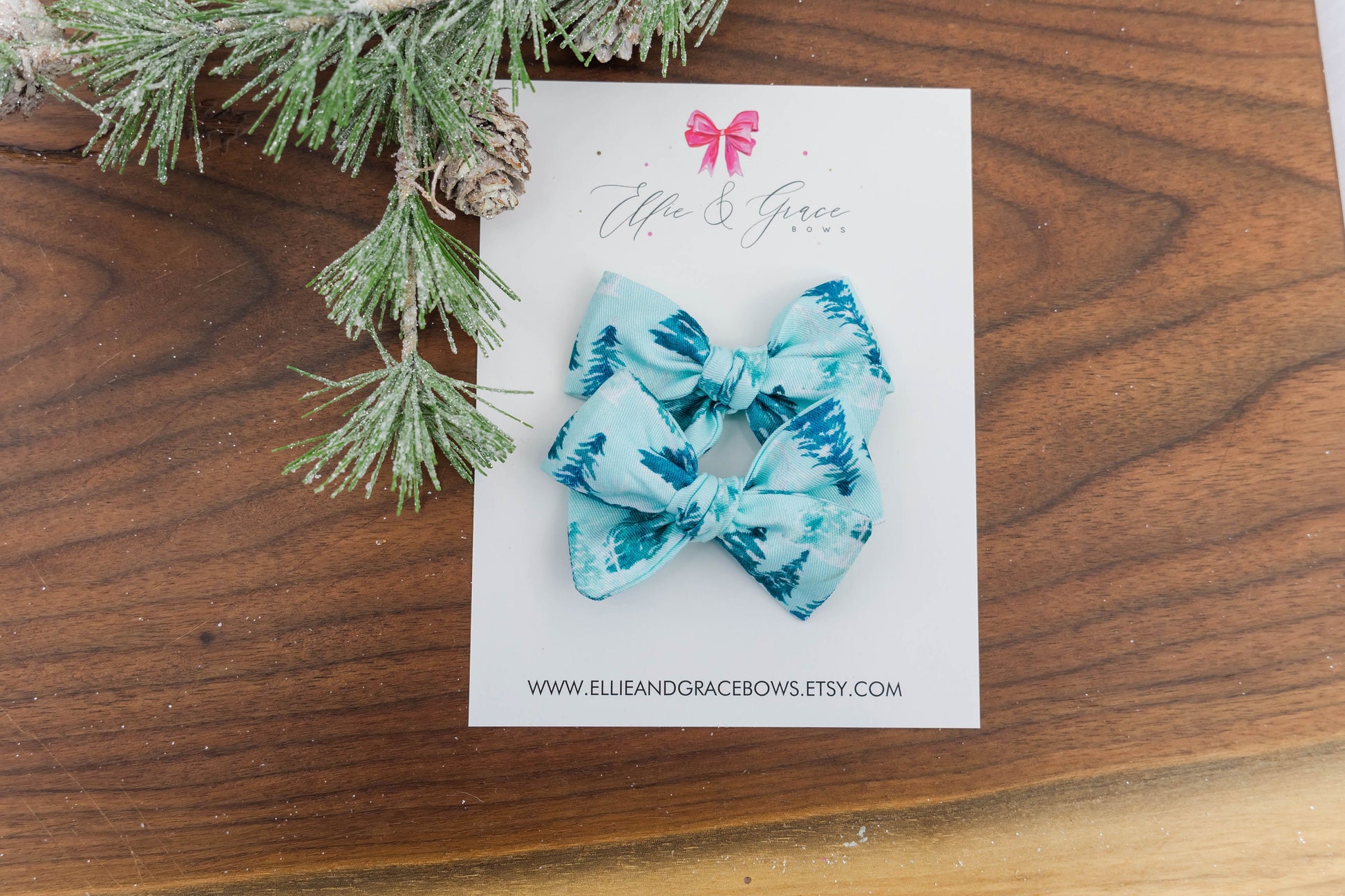 Blue Christmas Tree Pigtail Bow Set - Hand Tied Bows