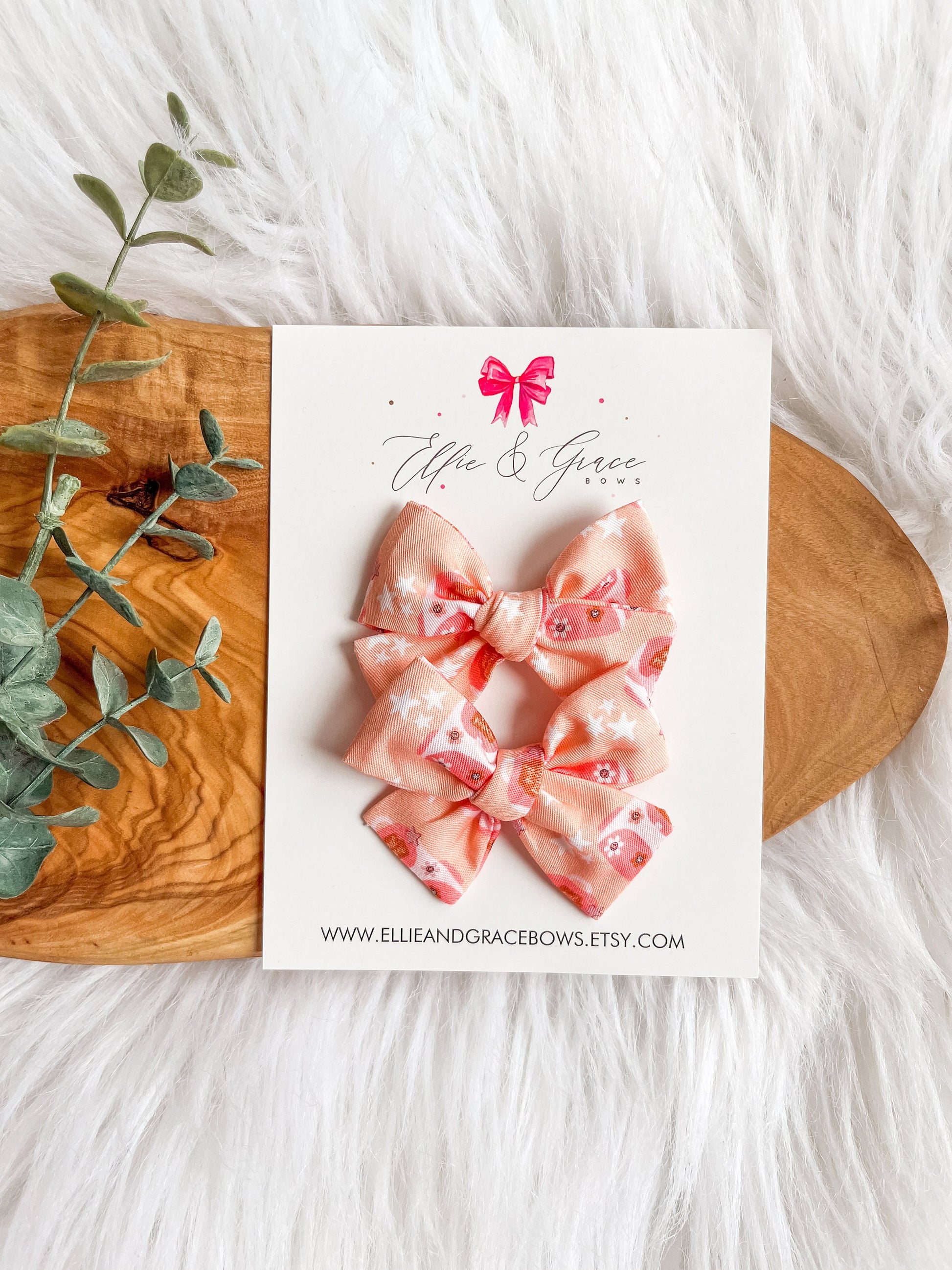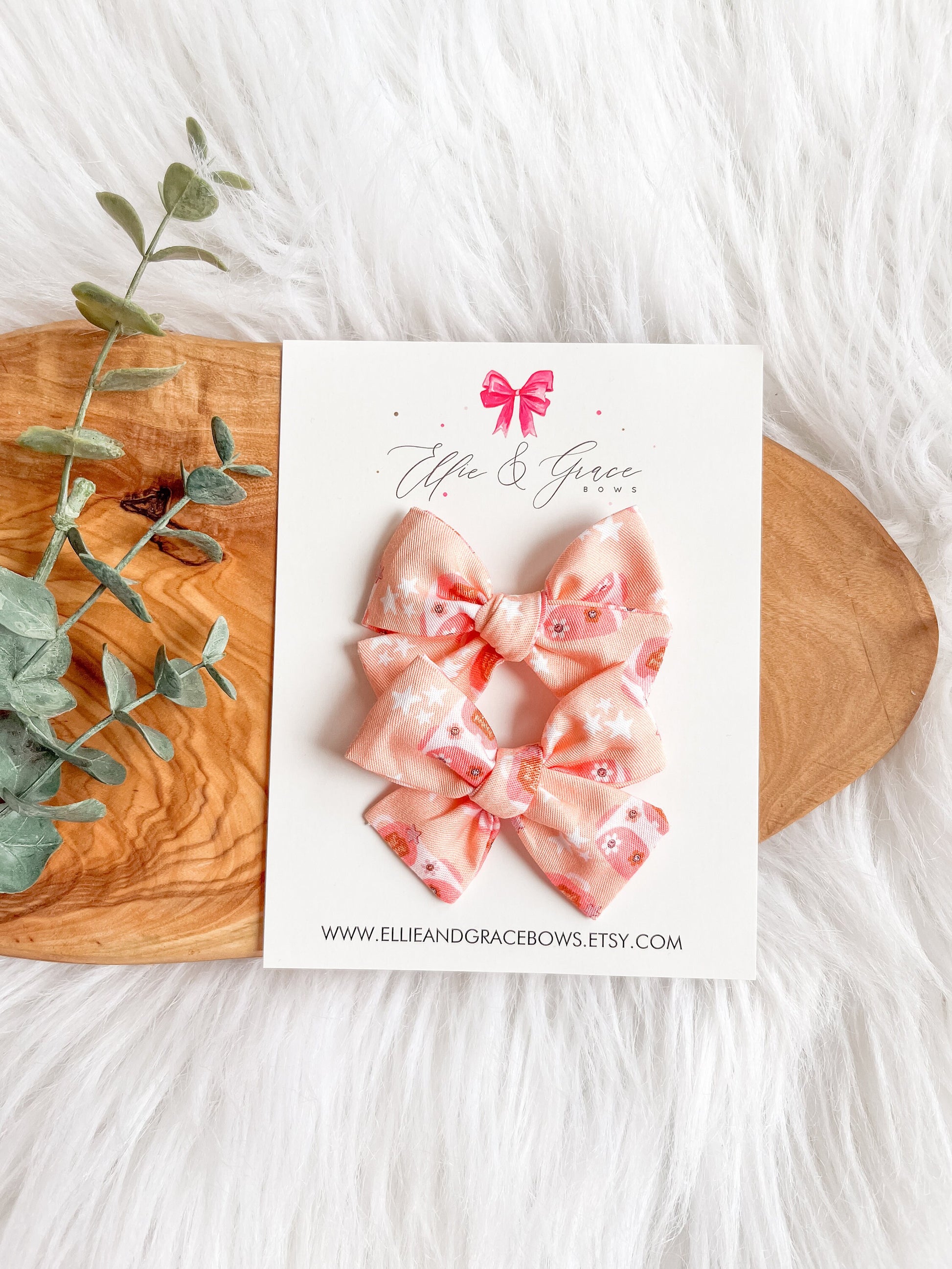 Our hair bows are handmade using the same fabric as shown in the above photo, however please be advised that there may be a slight difference in pattern placement.