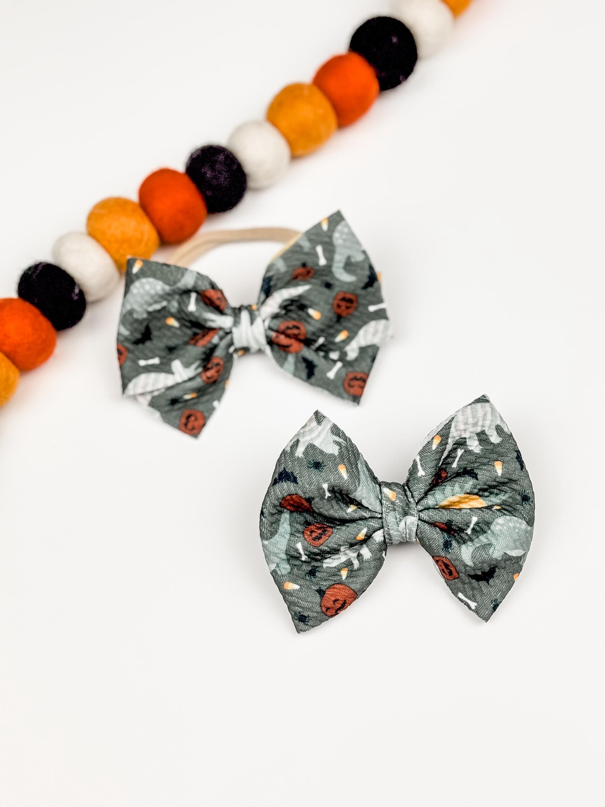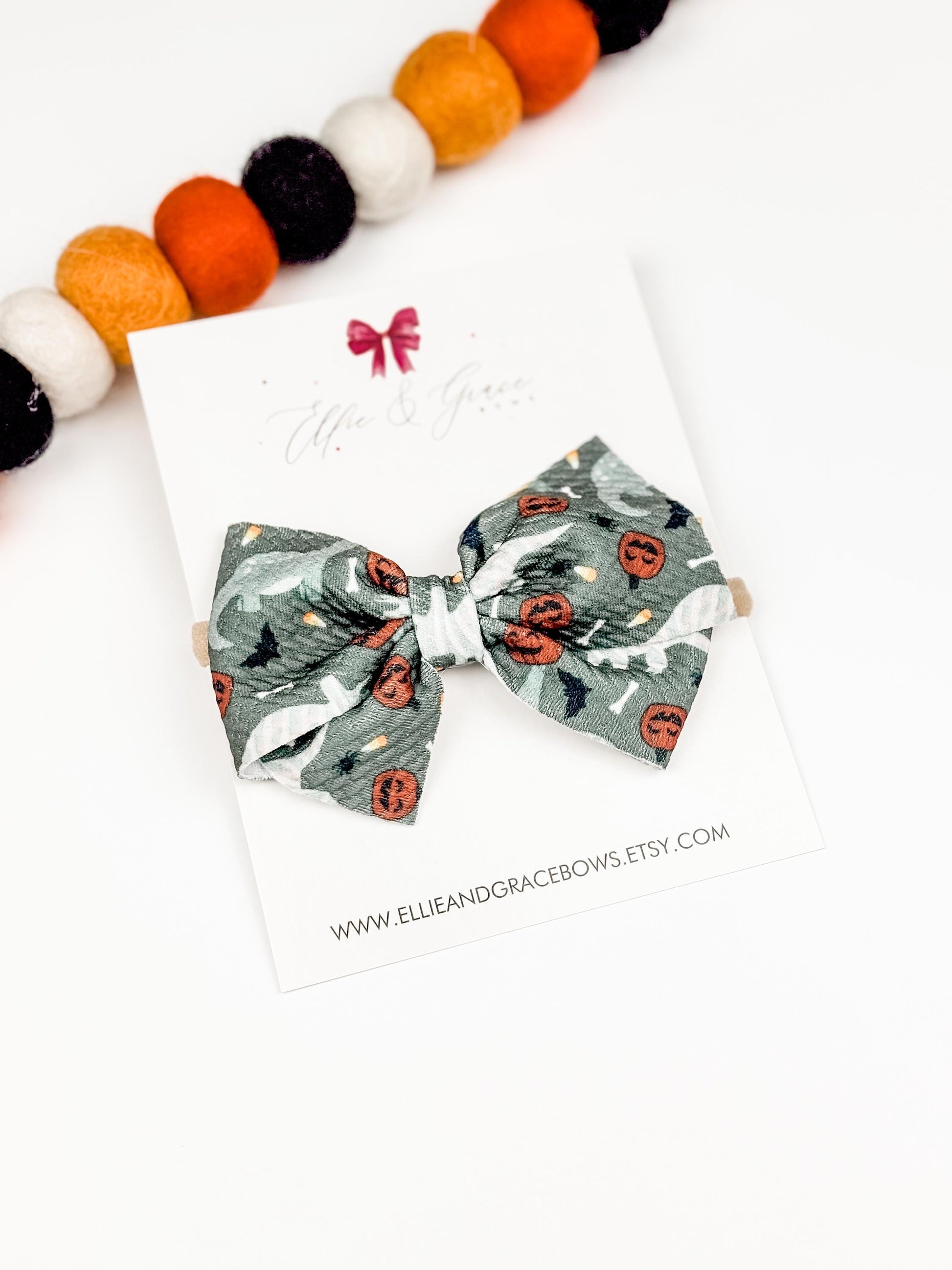 Get your little one ready for Halloween with these adorable hair bows, perfect for adding a festive touch to any outfit! Available in both Classic and Pinwheel styles, these bows feature a fun Halloween pattern that includes pumpkins, ghosts, bats, and more spooky elements.