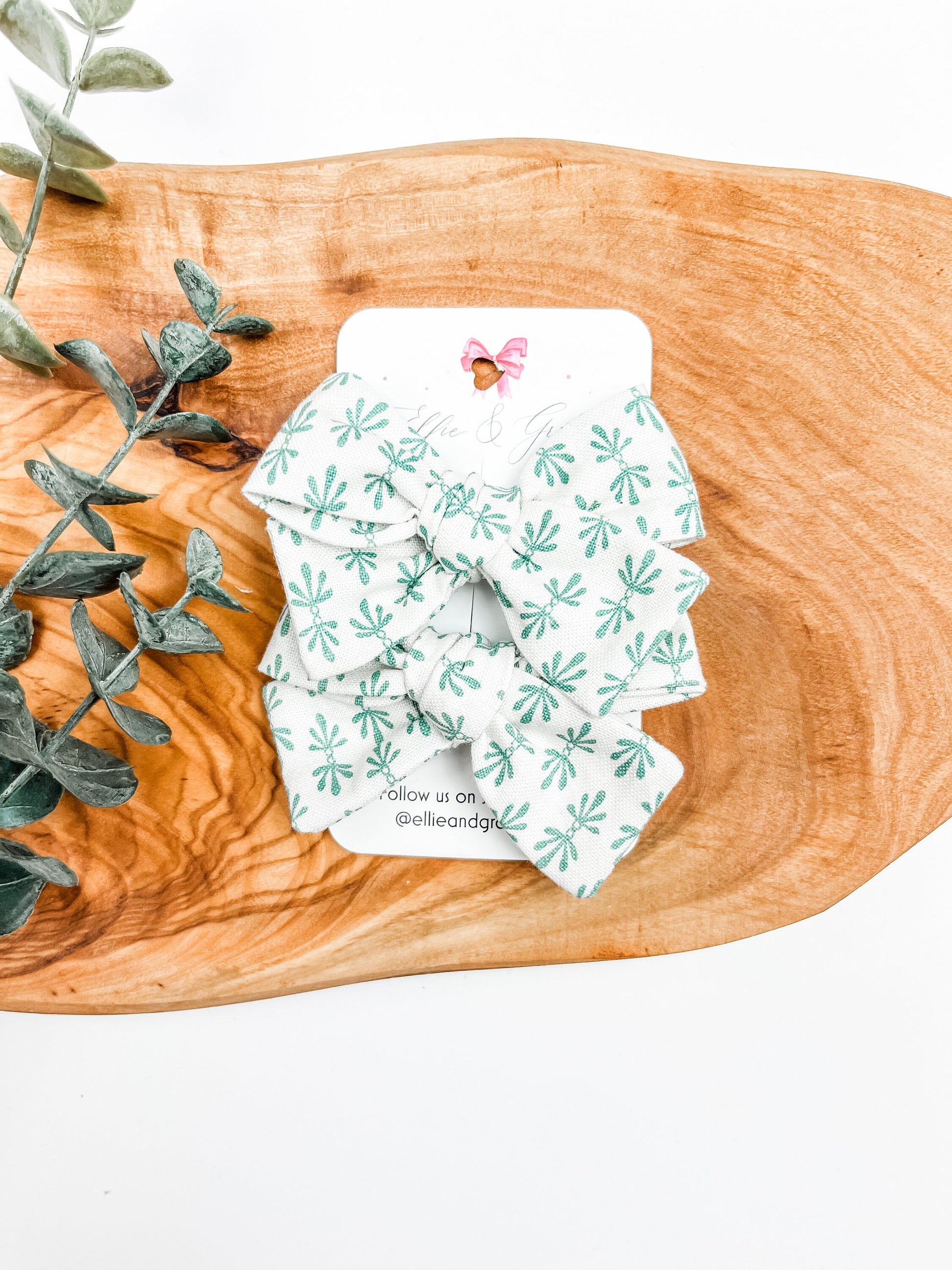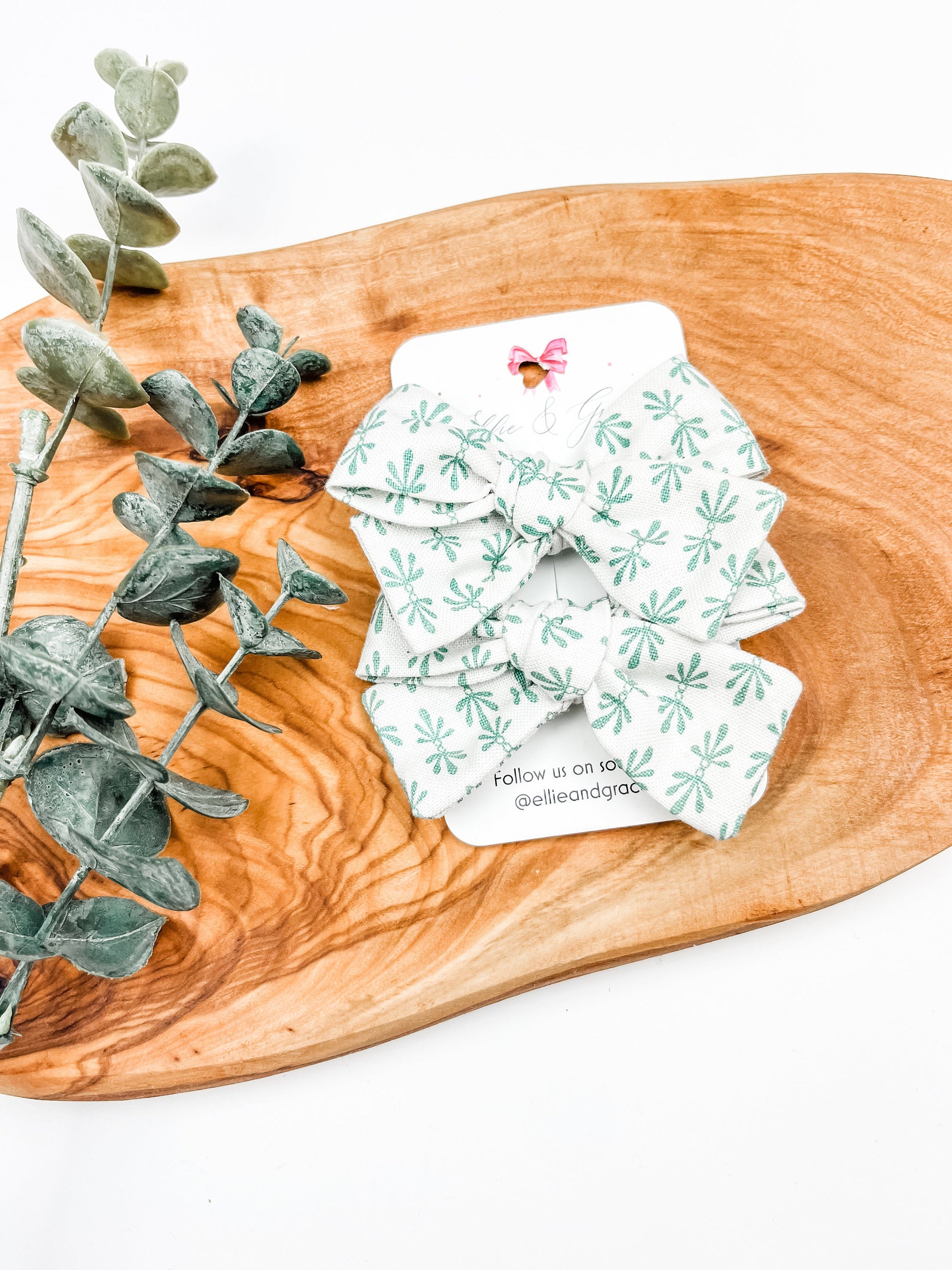 Green Floral Pigtail Bow Set - Hand Tied Cotton Fabric Bows