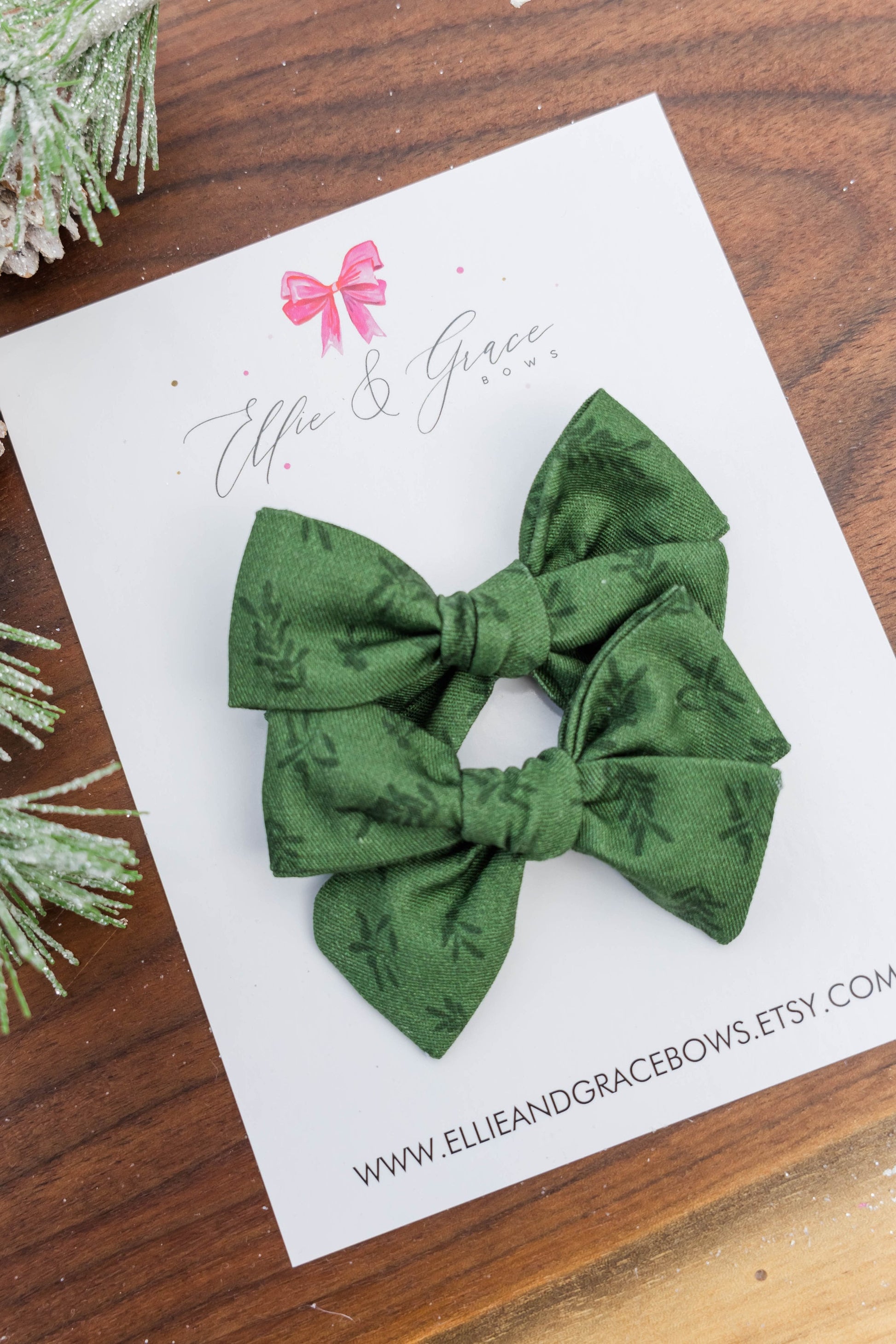 Green Flower Christmas Bows - Pigtail Bow Set - Cotton Fabric Alligator Clip Bows