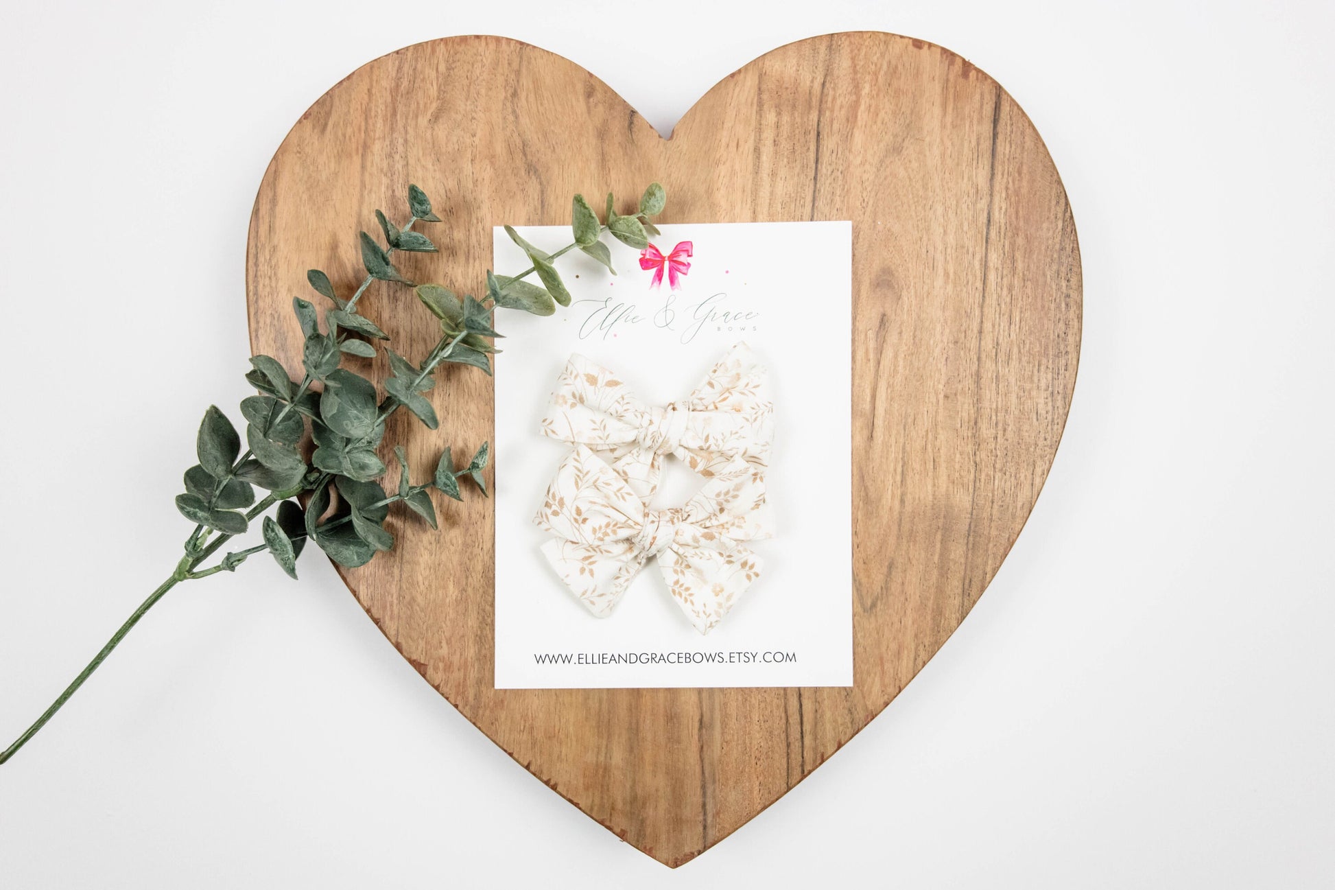 Neutral Colour Cotton Fabric Bow - Wildflower Hairbow - Cream and Brown Pigtail Bow Set