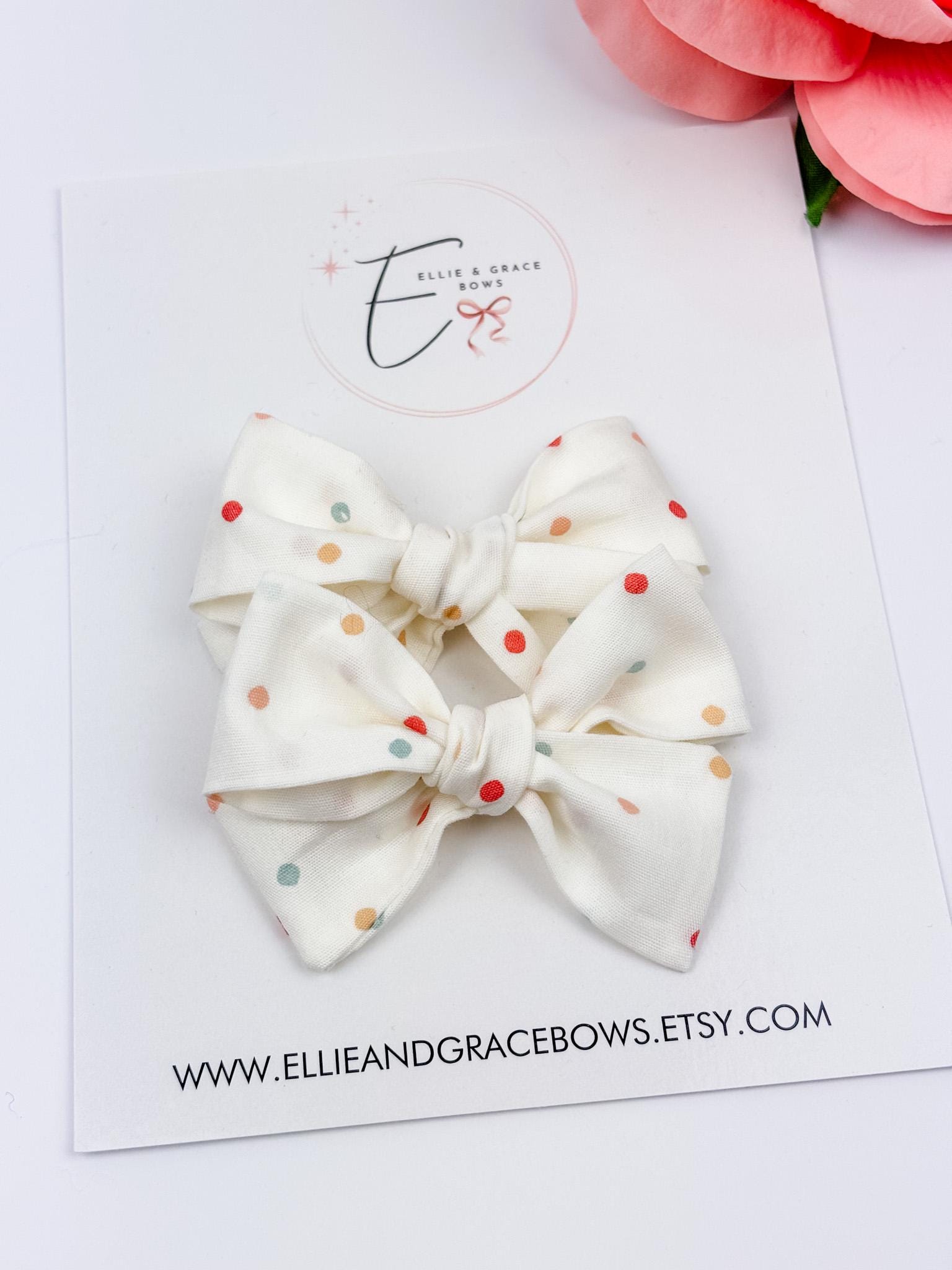 Add a sweet and playful touch to your little one's look with these charming cotton fabric pigtail bows. Measuring approximately 2.75 inches, each bow is made from soft, high-quality cotton and features a delightful multicolor polka dot print that’s perfect for everyday wear or special occasions.