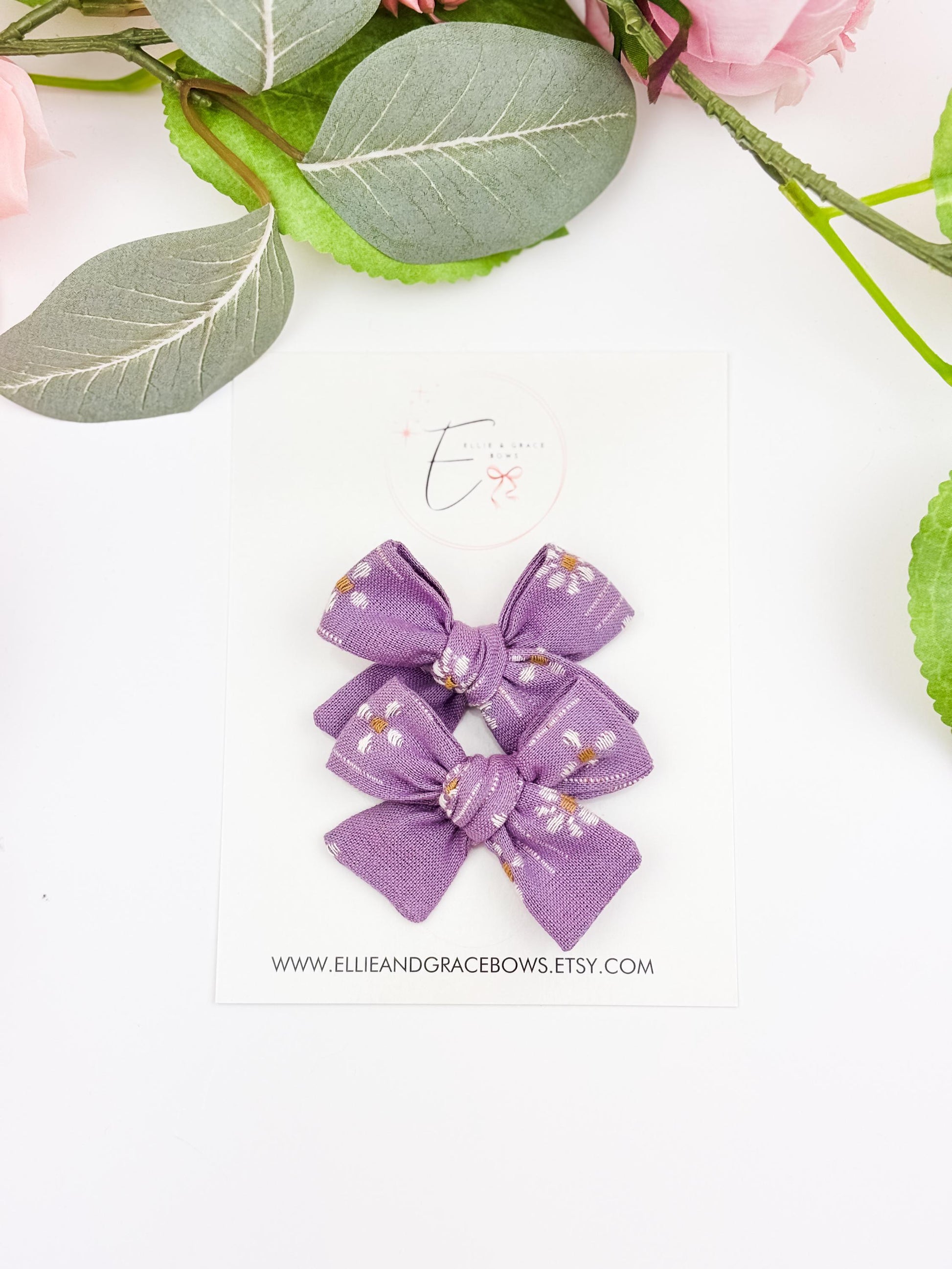 These bows showcase a delicate lavender floral print, perfect for springtime outfits, family photos, or everyday wear. Their versatile size makes them suitable for babies, toddlers, and young children alike.
